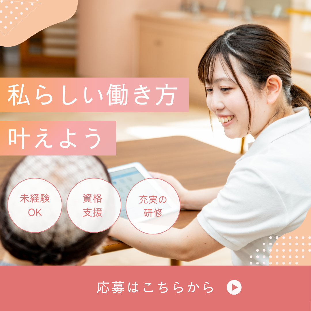 - 愛知県 | 介護職員 | 介護福祉士 | ホームヘルパー | 正社員 | 未経験OK | 資格なしOK | 新卒・第二新卒歓迎 | ブランクOK | 資格を活かせる | 40代以上活躍中 | 管理職・管理職候補 | I・Uターン歓迎 | 残業月10時間以内 | マイカー通勤可 | 社宅・家賃補助 | 産休・育休制度あり | 子育て中の方歓迎 |